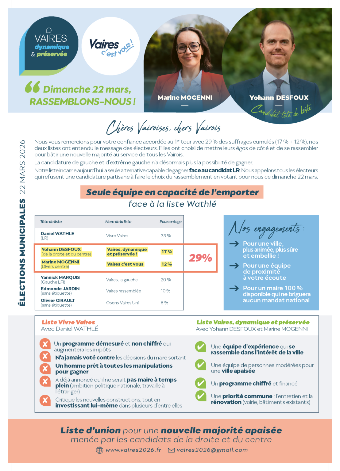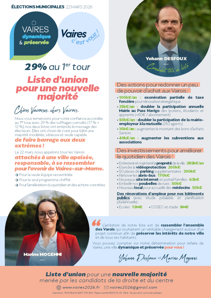 Pour ce second tour, nos deux listes ont fait le choix de l’union autour d’une conviction simple : mettre Vaires-sur-Marne avant les appareils politiques.
