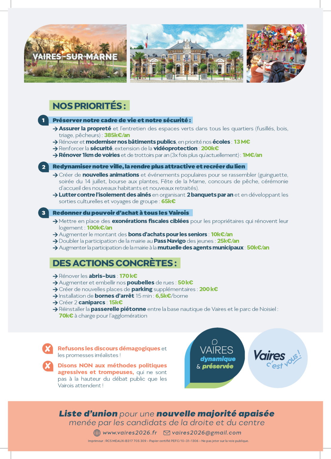 Découvrez un programme clair, structuré et responsable, construit à partir de vos priorités et de nos engagements pour l’avenir de Vaires-sur-Marne.